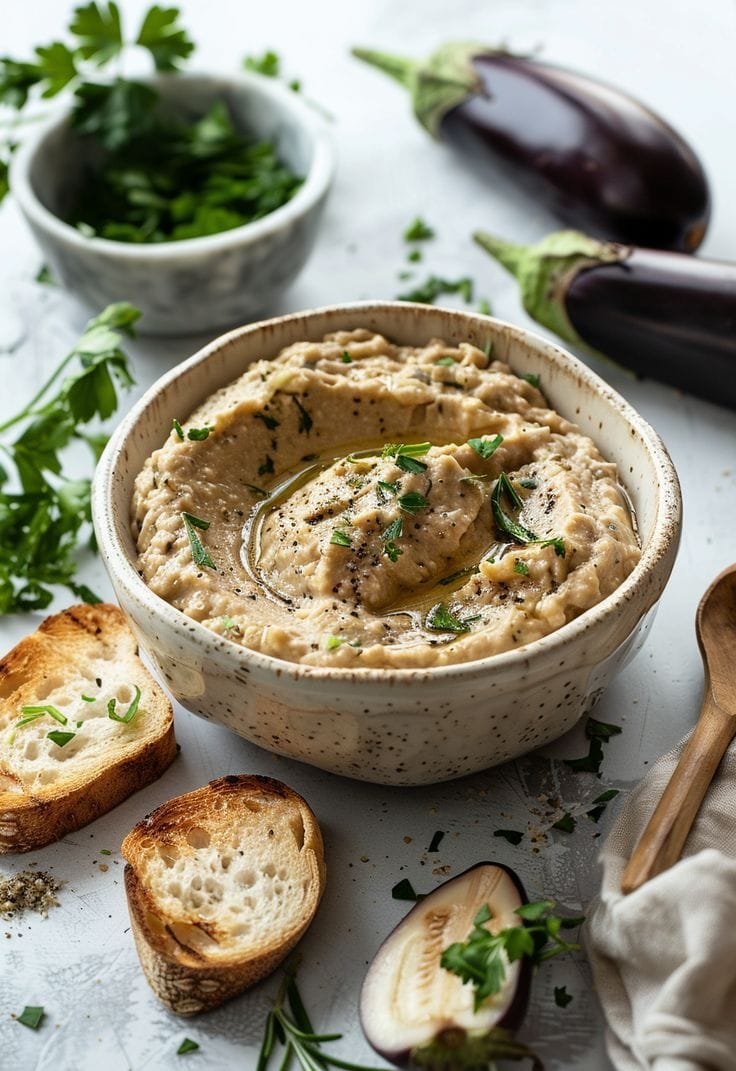 Baba ganoush is a classic Eastern Mediterranean dip made from roasted eggplants, tahini, garlic, lemon juice, and olive oil. This version emphasizes a smoky depth from either open-flame roasting or oven charring. The olive oil swirl not only adds richness but gives it a beautiful finish. Creamy, smoky, and tangy — it’s perfect as a dip, spread, or side.