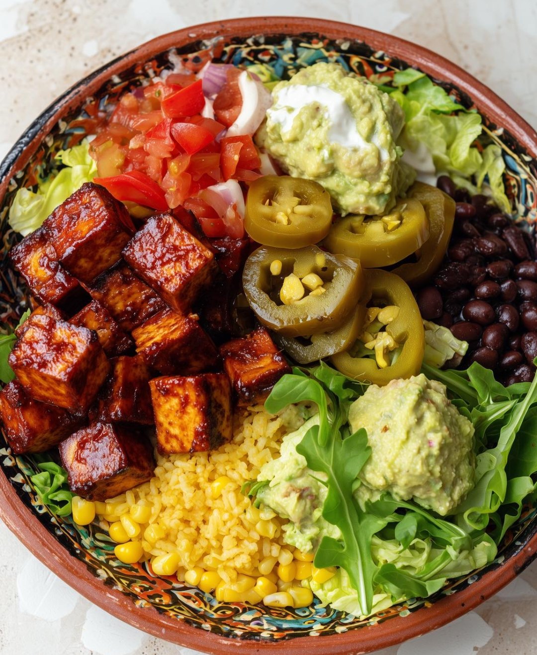 Add BBQ tofu, beans, corn, bell pepper, avocado, onion