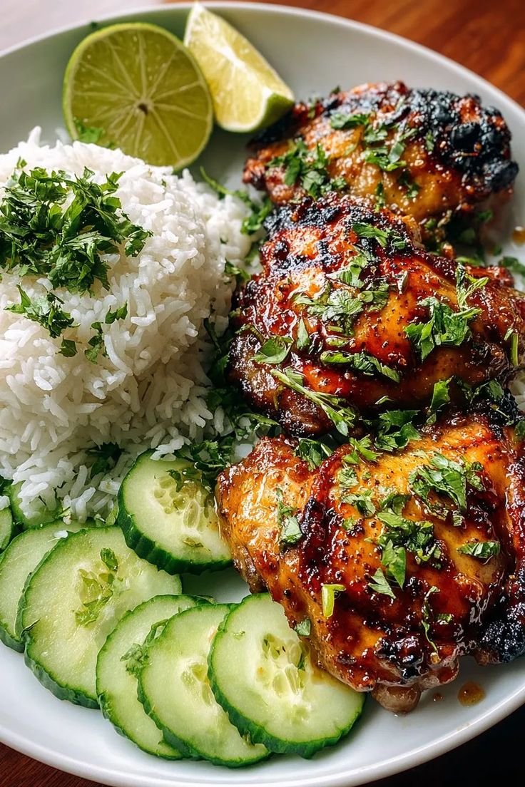 Smoky Grilled Chicken with White Garlic Rice & Pickled Cucumber