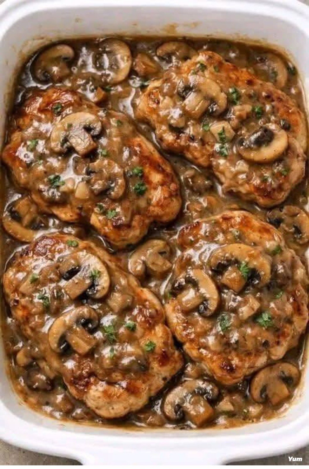 Juicy pan-seared chicken breasts simmered in a rich, creamy mushroom gravy. This comforting dish features tender chicken coated in a savory, garlicky sauce packed with mushrooms—perfect for a hearty dinner.