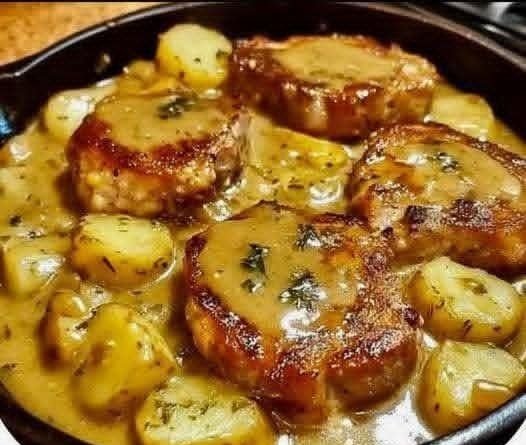 Tender pork chops are seared for flavor, then slow-cooked or simmered with potatoes in a savory, creamy gravy until everything is melt-in-your-mouth delicious. The potatoes soak up the rich sauce, making this a full meal in one dish.