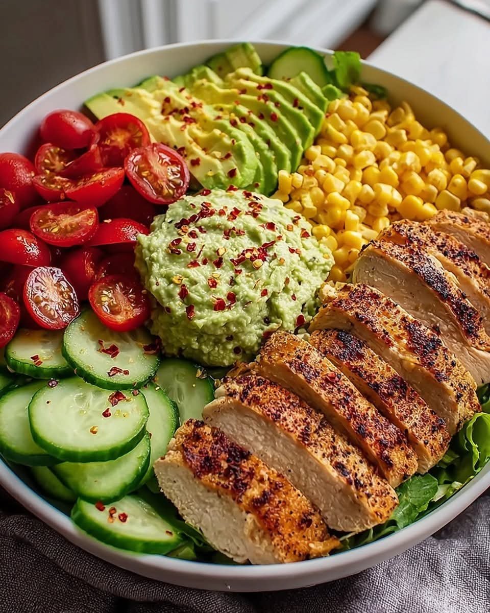 This vibrant Southwest bowl is a perfect balance of smoky, spicy, and creamy flavors. Grilled chicken seasoned with southwest spices sits atop a bed of fresh greens, juicy tomatoes, crisp cucumbers, and sweet corn. A creamy avocado adds richness, while a hint of lime and chili flakes give a bright, zesty kick. Quick to prepare, it’s perfect for lunch or dinner and easily customizable.