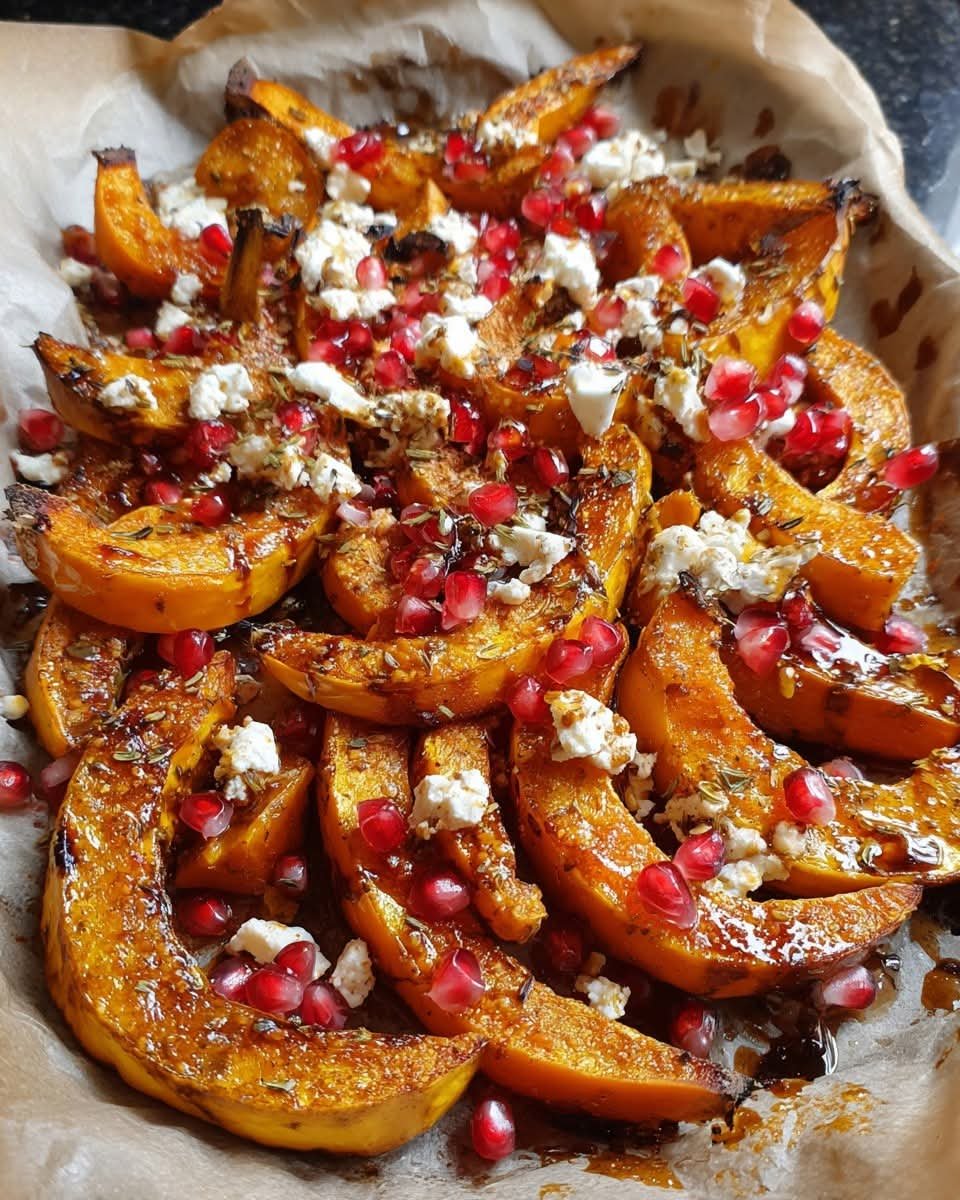 Roasted spiced pumpkin wedges are paired with creamy feta and juicy pomegranate seeds, finished with a zesty citrus drizzle. This dish balances sweet, savory, and tangy flavors beautifully, making it an elegant side or a light vegetarian main.