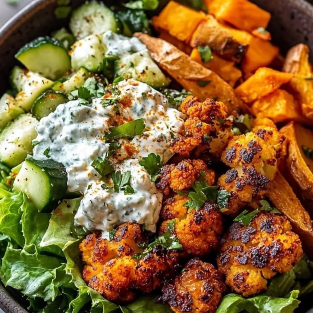This spiced roasted cauliflower and sweet potato bowl is a flavorful healthy and satisfying meal. The mix of crispy veggies creamy yogurt sauce and refreshing cucumber salad makes every bite delicious. Whether for meal prep or a quick dinner this dish is a perfect balance of taste and nutrition!