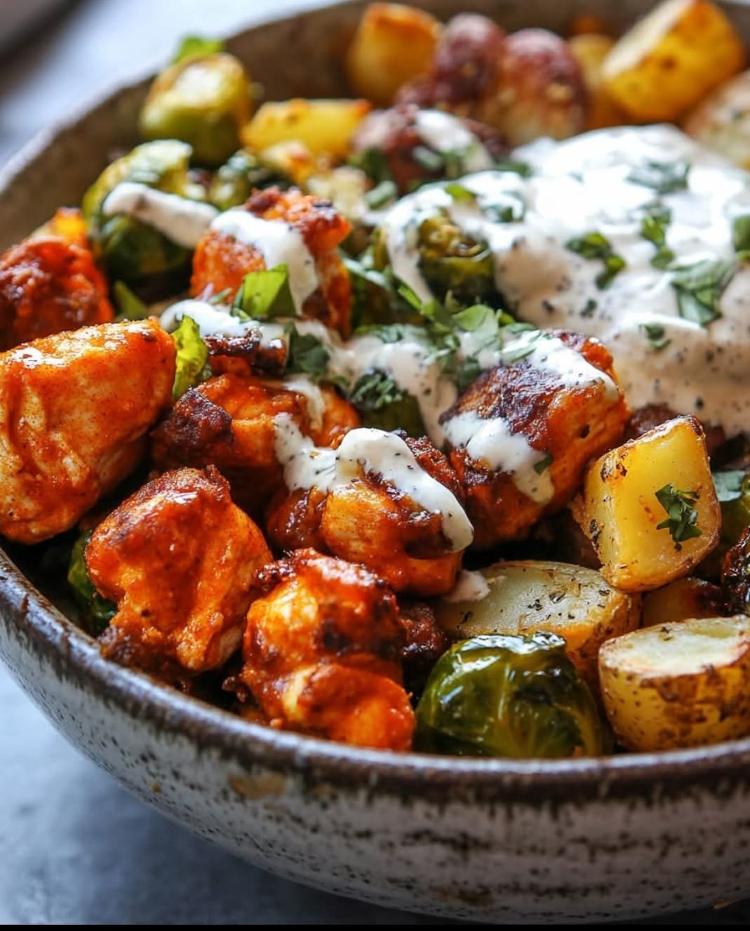 This Spicy Buffalo Bites dish is a perfect combination of crispy, juicy chicken (or tofu for a vegetarian option) coated in a zesty buffalo sauce, paired with golden roasted potatoes and caramelized Brussels sprouts. It’s a satisfying meal with bold flavors and a great balance of protein, healthy fats, and fiber.
