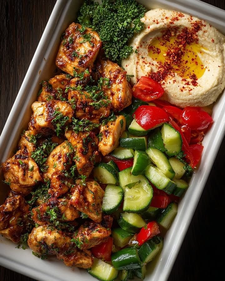 This hearty Mediterranean bowl brings together juicy spicy-garlic chicken, creamy hummus, fluffy rice (or grains), and a refreshing cucumber salad. Each bite hits all the right notes — savory, zesty, slightly spicy, and cooling. A complete, protein-rich meal that feels indulgent yet wholesome.
