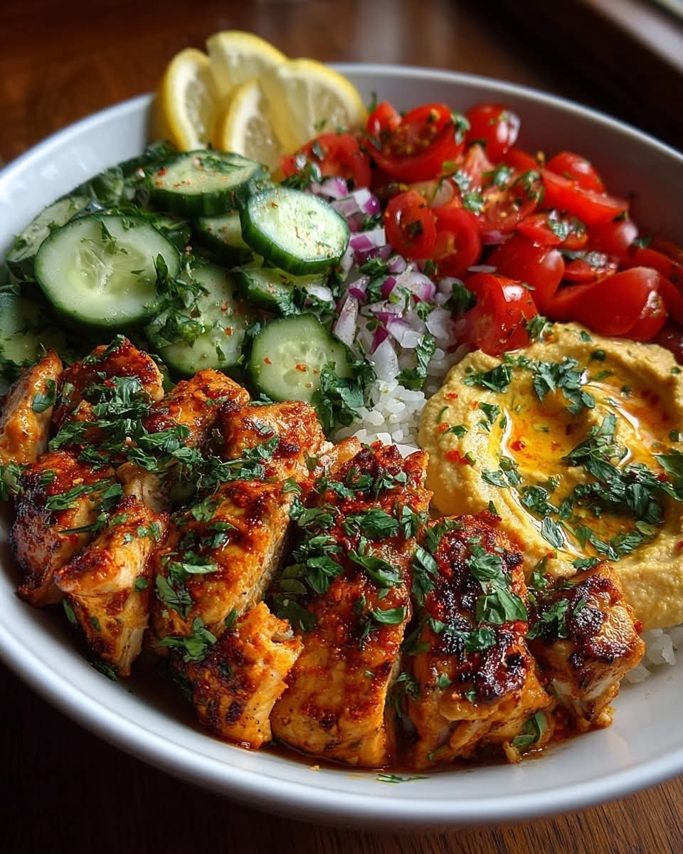 This flavorful bowl features tender spicy-garlic seared chicken, served warm over fluffy rice or grains, paired with a refreshing lemony cucumber salad and a creamy scoop of hummus. The dish balances heat, freshness, and richness, making it a perfect weeknight meal or meal-prep favorite.