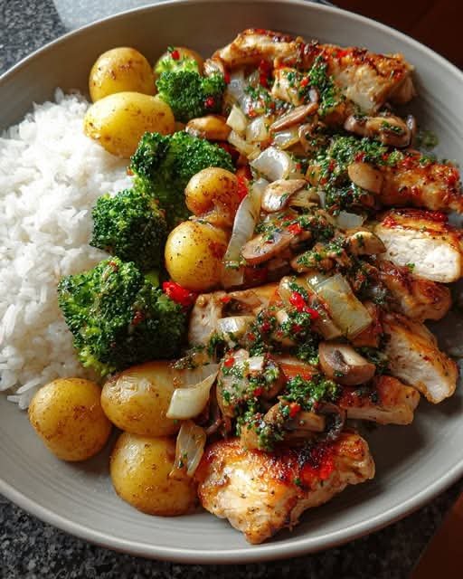 Spicy Herb Chicken with Baby Potatoes, Broccoli & Garlic Rice
