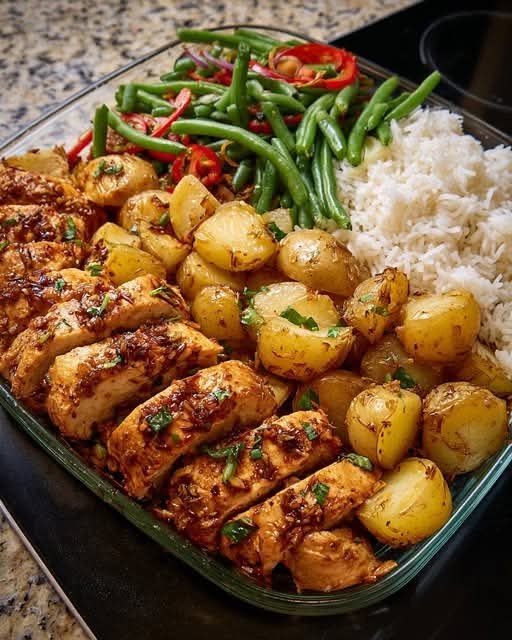 This dish is a perfect balance of heat, flavor, and comfort. Tender, juicy chicken is coated in a spicy rub and roasted to perfection alongside garlic-infused potatoes. Crisp-tender green beans add freshness, and a simple, fluffy rice base completes the meal. It’s a one-pan (plus rice) dinner that’s hearty, wholesome, and packed with flavor