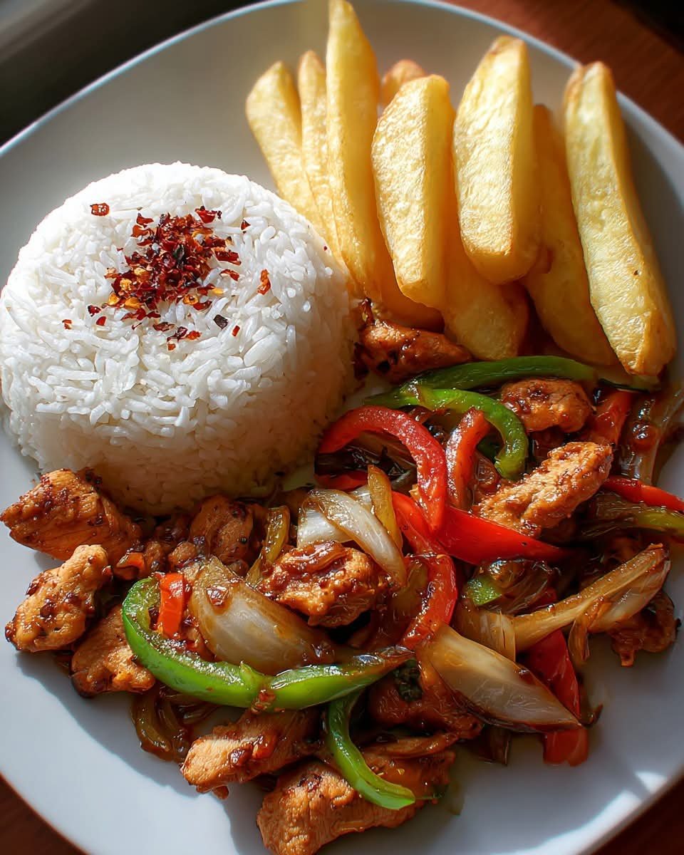 Spicy Pepper Chicken Stir-Fry with Rice & Crispy Fries