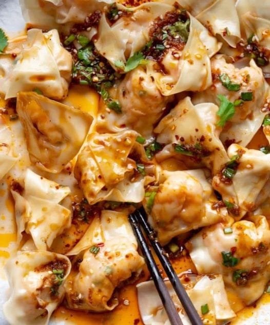 A spoonful of the prawn mixture should be placed in the middle of a wonton wrapper. Put some water on the edges of the wrapper and let it moisten. To make a triangle, fold the sides of the wrapper over the filling and then fold it over again. To release as much air as possible, apply pressure all the way around the perimeter of the triangle. The two points of the triangle’s long edge should be brought together, you should wet the tips, and then you should push them together. An example of a dumpling that is shaped like a bonnet or a diamond is something you should know about. A tray that has been lined with baking paper should be used. Proceed with the remaining wrappers and filling in the same manner. Refrigerate or freeze the mixture until it is ready to be cooked, then cover it with cling film. - Using a small bowl, mix all of the ingredients together to make the spicy red oil sauce called Step 3.