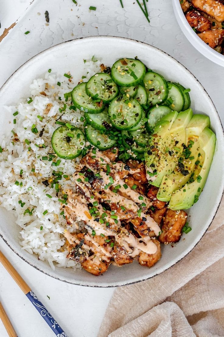 This bowl combines the richness of salmon, the light sweetness of coconut rice, crisp cucumbers, and buttery avocado. The spicy sauce ties everything together with a bright, zesty kick. A balanced and nourishing bowl that feels fresh, filling, and flavorful.