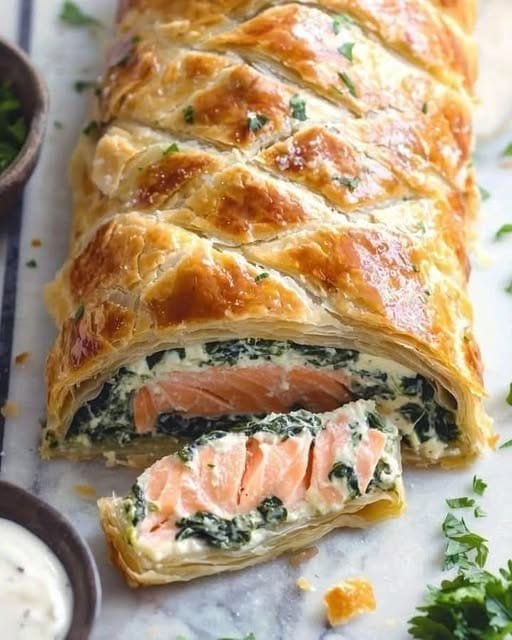 Wrap in puff pastry: Roll out the puff pastry and place the stuffed salmon in the center. Fold the pastry around the salmon, sealing the edges. Place seam-side down on a baking sheet lined with parchment paper.