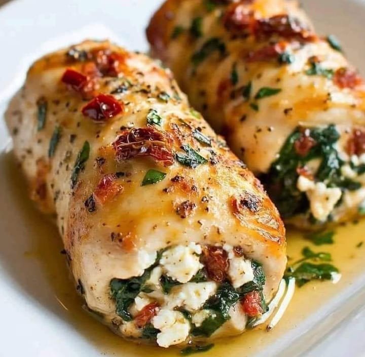 Spinach and Feta Chicken Rolls are a delightful and savory dish where tender chicken breasts are flattened and then stuffed with a flavorful mixture of spinach, feta cheese, and sometimes garlic and herbs. The filling is usually creamy and tangy, thanks to the feta, and the spinach adds a fresh, earthy flavor. The chicken is rolled up tightly around the filling, secured with toothpicks, and then baked until golden and juicy. Some variations include a light coating of breadcrumbs or a drizzle of olive oil to enhance the crispiness of the outside. The dish is often garnished with fresh herbs or a squeeze of lemon juice, adding a bright finish. Perfect as a main course, these rolls are both visually appealing and delicious, offering a combination of tender chicken and a rich, cheesy filling.