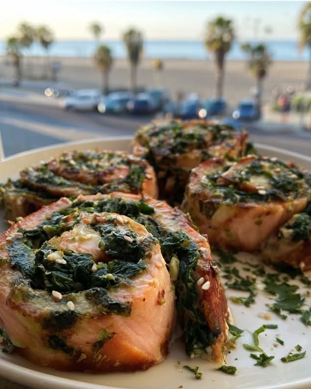 Sear pinwheels cut-side down in a hot oven-safe skillet with a little oil for 2–3 minutes per side.
