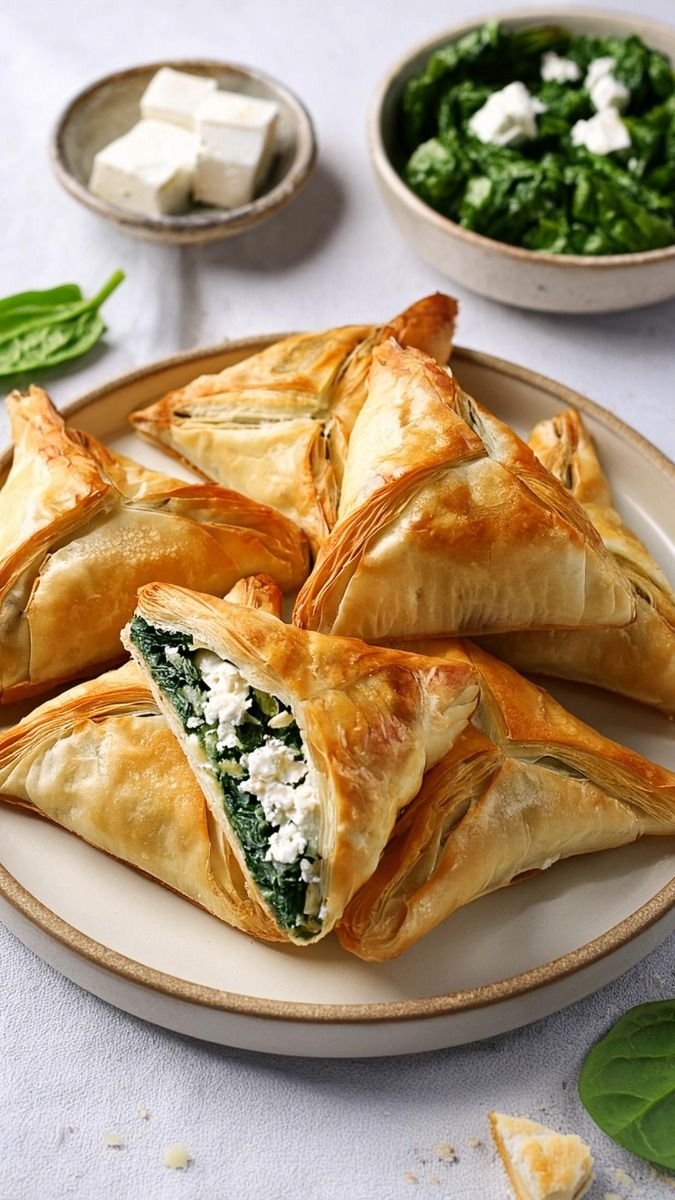 These crispy, golden-brown phyllo triangles are stuffed with a flavorful blend of spinach, feta cheese, and fresh herbs. They’re perfect as an appetizer, snack, or light meal. This classic Mediterranean pastry balances flaky layers with a creamy, savory filling — utterly addictive yet light enough to stay healthy.