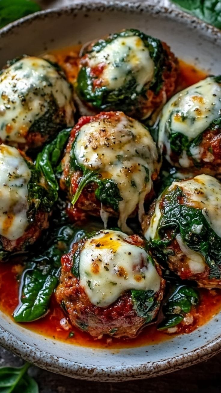 These tender turkey meatballs are packed with sautéed spinach, garlic, fresh herbs, and filled with or topped with melty mozzarella cheese. They’re oven-baked for a healthier touch but still juicy and full of Mediterranean-inspired flavor.