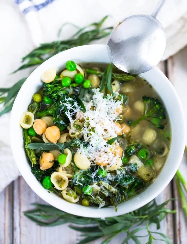 Early spring vegetables like asparagus, peas, fennel, broccoli and give the soup its vibrant green color, while fresh tarragon adds a unique flavor. Play around with the vegetables and make it your own, taking special care not to overcook them. If going gluten-free, try a bean or rice pasta.Keep the soup vegan or sprinkle with romano cheese.