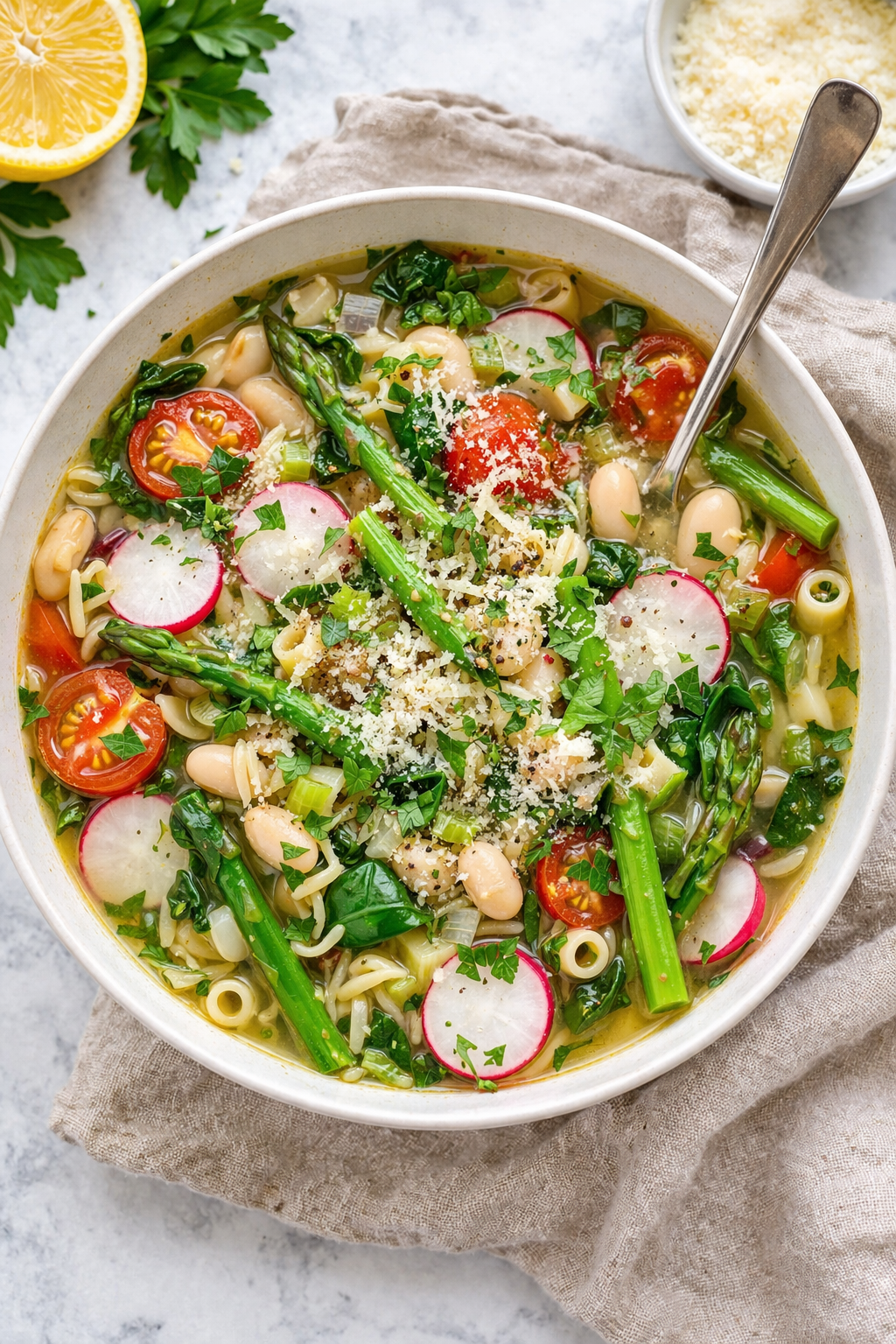 A light, fresh, and colorful soup loaded with seasonal vegetables, beans, and small pasta in a flavorful broth. This spring version is brighter and lighter than traditional minestrone—perfect for a healthy, comforting meal 💚