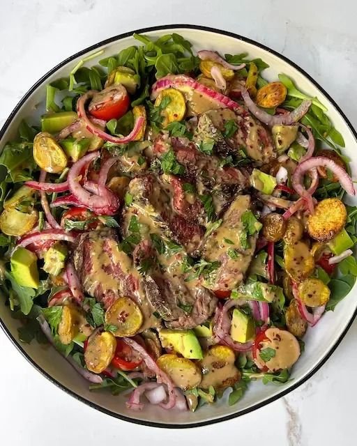 Tender, seared steak sliced thin, paired with golden crispy potato wedges, fresh salad greens, cherry tomatoes, and a rich, creamy balsamic dressing.This is textural heaven: crunchy potatoes, juicy steak, and tangy creaminess in every bite — Mediterranean-inspired, elegant, and filling.