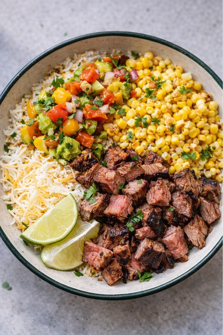 A vibrant, flavor-packed bowl combining juicy steak, sweet corn, fresh vegetables, and a bright, tangy mango salsa. It’s a perfect balance of savory, sweet, and fresh—great for lunch or dinner.
