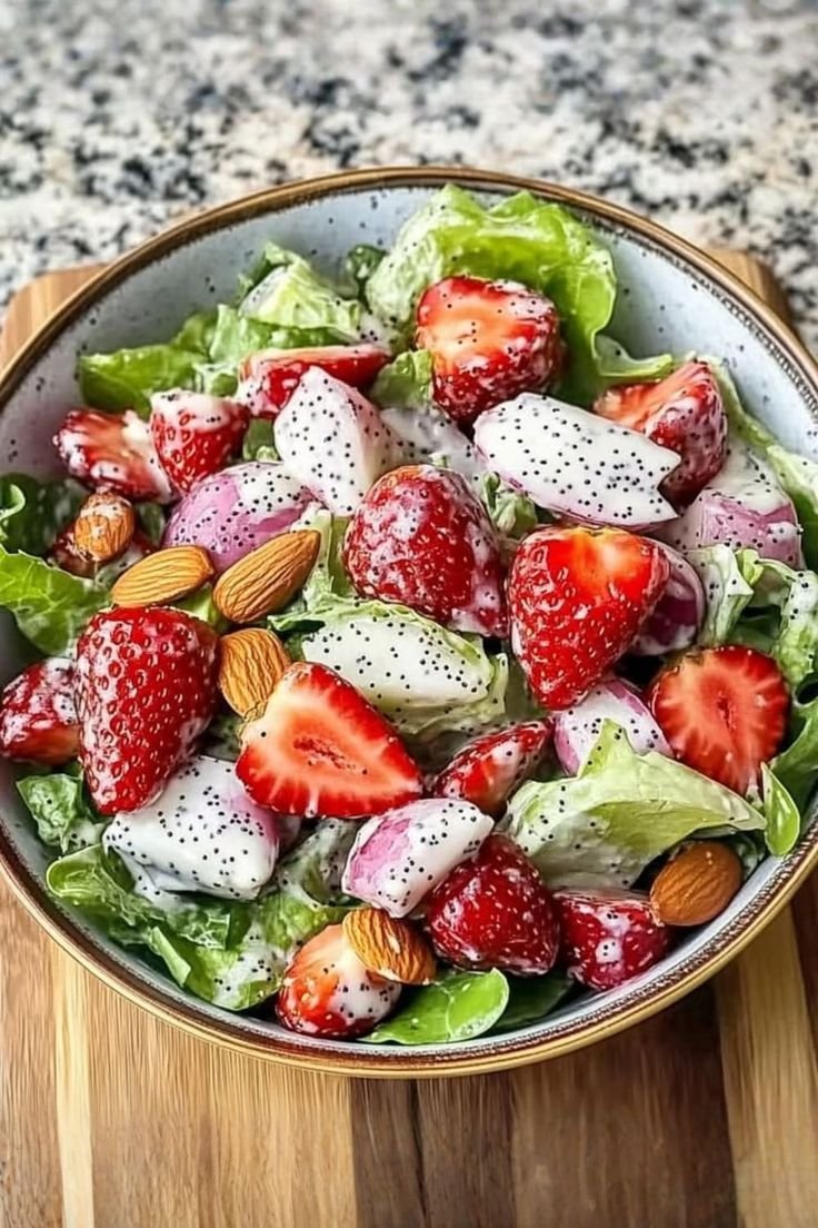 A classic crowd-pleaser with Mediterranean-friendly ingredients. Sweet strawberries pair with crunchy nuts and a bright poppyseed dressing that’s light yet satisfying—great as a side or a light meal.