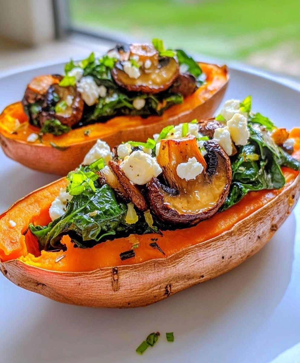 These stuffed sweet potatoes are warm, comforting, and full of nourishing flavors. Earthy mushrooms and vibrant spinach are sautéed with fragrant rosemary, then tucked into roasted sweet potatoes and topped with creamy feta. A lemon garlic dressing drizzled over the top brightens every bite. It’s a wholesome and satisfying dish that’s naturally gluten-free and perfect for meal prep or Meatless Mondays.