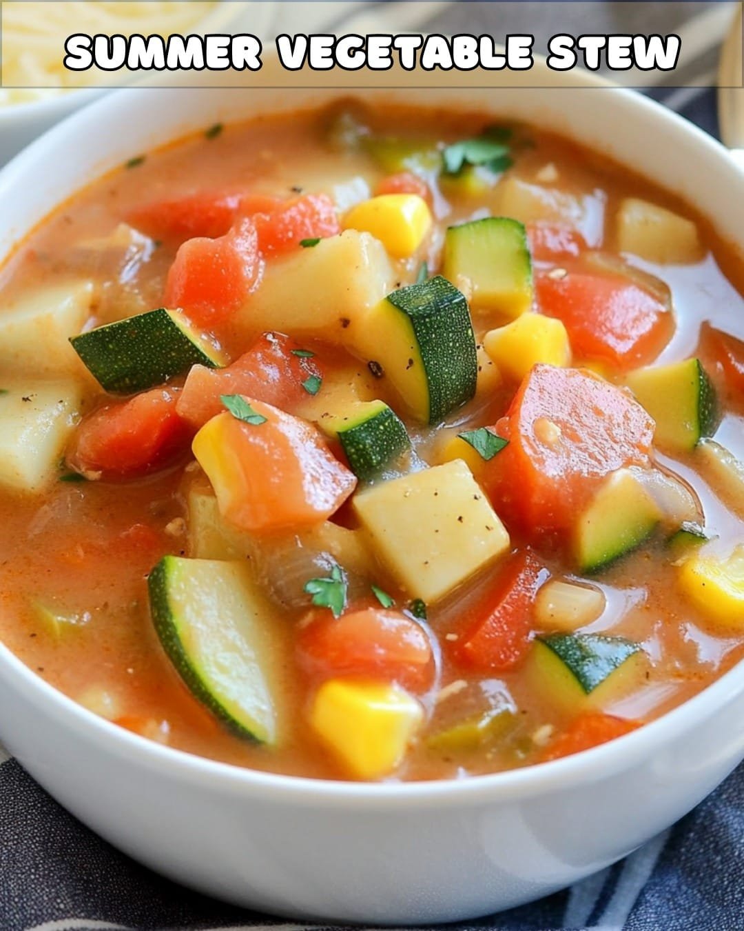 A vibrant and nutritious stew celebrating the freshness of summer vegetables, featuring a colorful medley of seasonal produce, tender chunks of vegetables, and a light, herb-infused broth.