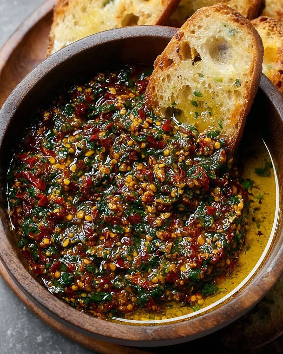 Sun-Dried Tomato Olive Oil Bread Dip is a rich, aromatic, and herb-infused dipping oil loaded with bold Mediterranean flavors. Sweet and tangy sun-dried tomatoes combine with garlic, herbs, olive oil, and optional cheese to create a restaurant-quality dip that pairs beautifully with warm crusty bread, focaccia, or toasted baguette. It’s quick to prepare, requires no cooking, and tastes even better as it sits.