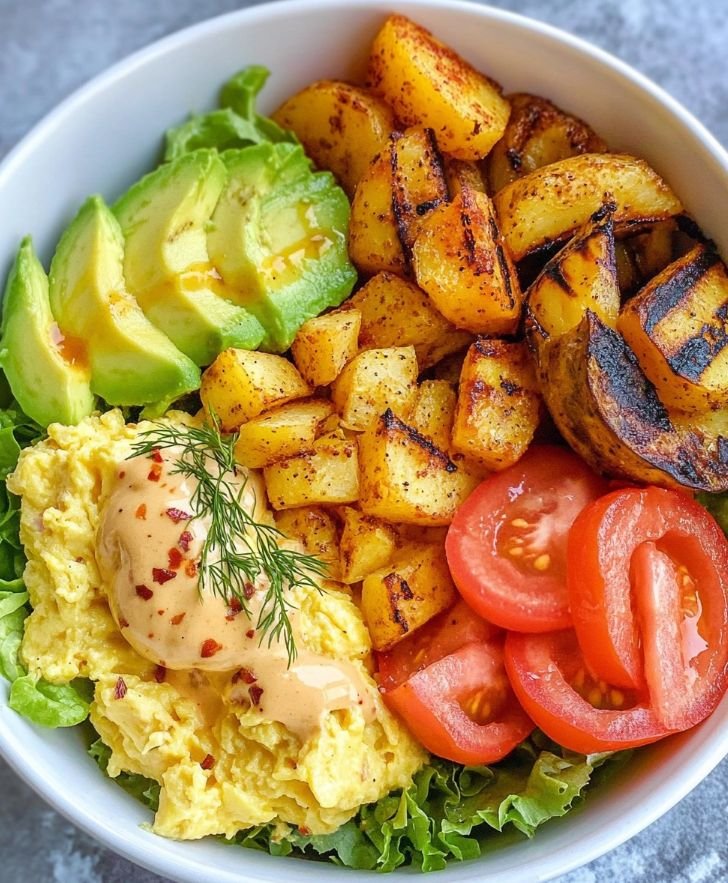 A vibrant, nutrient-packed breakfast bowl to kickstart your day, featuring protein-rich eggs, creamy avocado, fiber-rich grains, and fresh seasonal fruits. Bright, fresh, and Mediterranean-friendly—non-spicy and energizing.