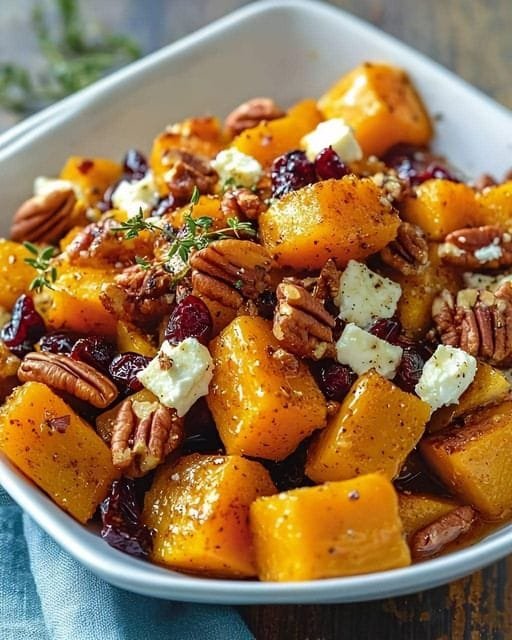 Sweet and Savory Honey Roasted Butternut Squash with Cranberries, Pecans, and Feta.