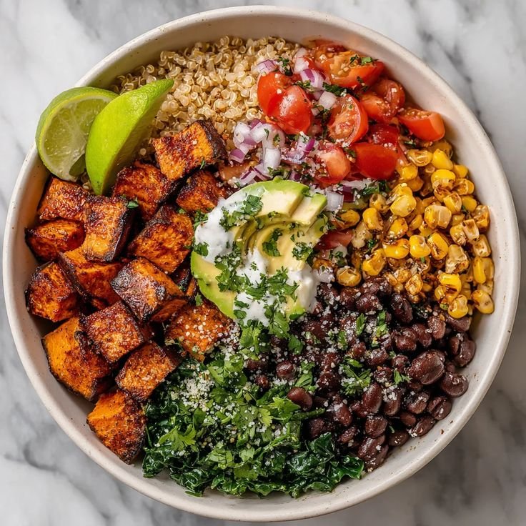 A vibrant plant-based bowl featuring roasted sweet potatoes, protein-rich black beans, fresh crunchy veggies, and a creamy lemon-tahini yogurt drizzle. Naturally high in fiber, antioxidants, and slow carbs—this bowl keeps you full and energized.