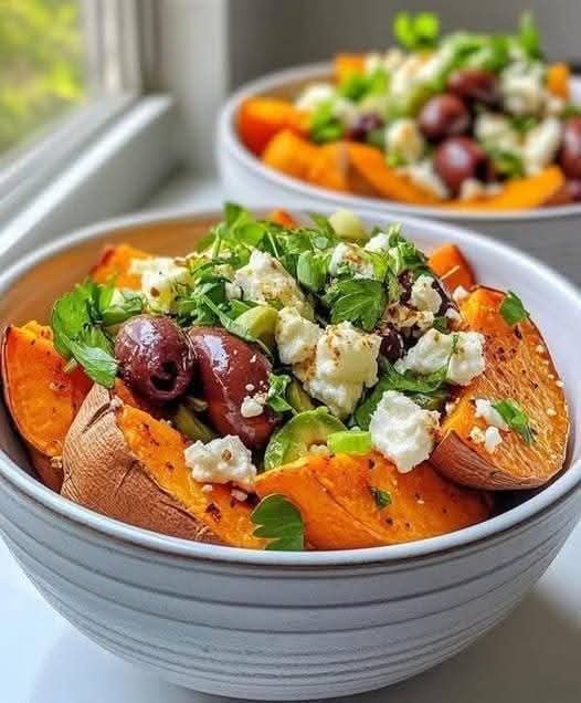 This Mediterranean-inspired nourish bowl combines roasted sweet potatoes, creamy hummus, briny olives, and tangy feta cheese for a satisfying and wholesome meal. Perfect for meal prep or a quick, healthy lunch!