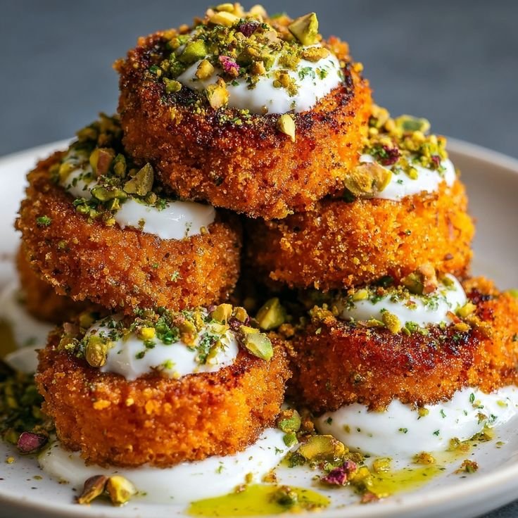 Crispy golden sweet-potato croquettes with a creamy, lightly herbed center, served alongside a luscious burrata yogurt dip and finished with a crunchy pistachio–lemon topping. Sweet, savory, creamy, and crunchy in every bite — a true Mediterranean winter treat.