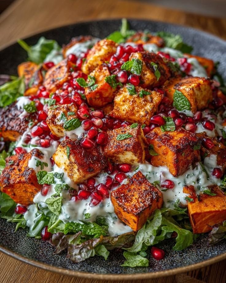This vibrant salad pairs roasted caramelized sweet potatoes with golden, crispy halloumi, juicy pomegranate arils, and fresh greens, all finished with a cool minty yogurt dressing. It’s hearty enough for a main, elegant enough for guests, and perfect for Mediterranean-style eating.