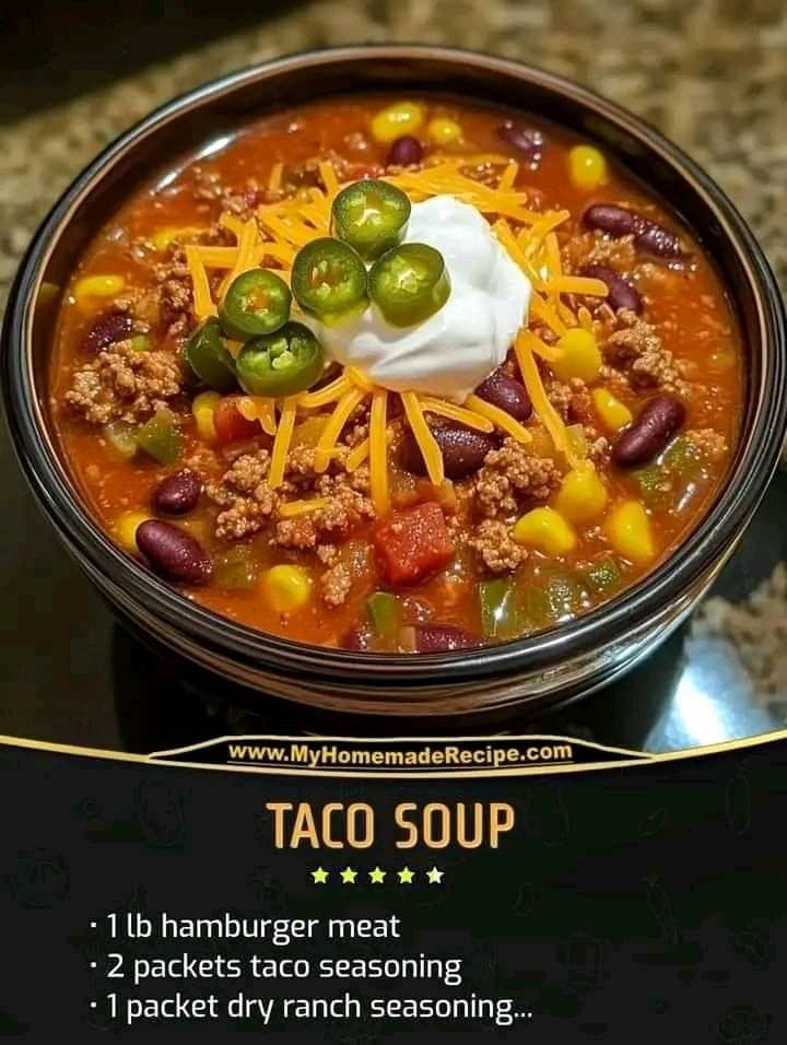 “Get ready to warm up with a flavorful and fiesta-inspired twist on traditional soup! Our Taco Soup is a hearty, comforting blend of tender ground beef, crunchy taco shells, and creamy beans, all swimming in a rich and spicy broth that’s bursting with the bold flavors of the Southwest. This satisfying and easy-to-make recipe is perfect for a chilly evening, a casual gathering, or a quick weeknight dinner that’s sure to become a family favorite. With its vibrant colors, lively textures, and addictive flavors, Taco Soup is a true crowd-pleaser that will leave you craving for more. So why not gather your loved ones and dive into a bowl of this deliciously spicy, satisfyingly savory, and utterly addictive Taco Soup?