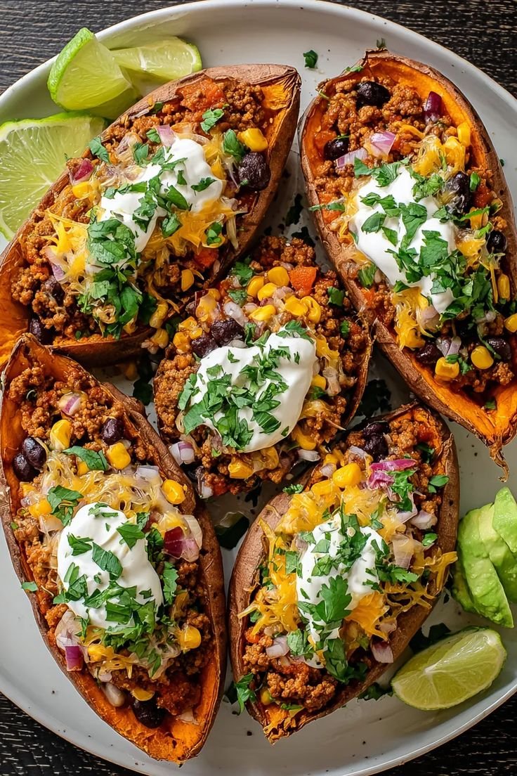 These baked sweet potatoes are loaded with spiced ground turkey or beef, black beans, corn, and fresh toppings. Topped with avocado, Greek yogurt, and fresh herbs, they make a vibrant, balanced, and protein-rich meal.