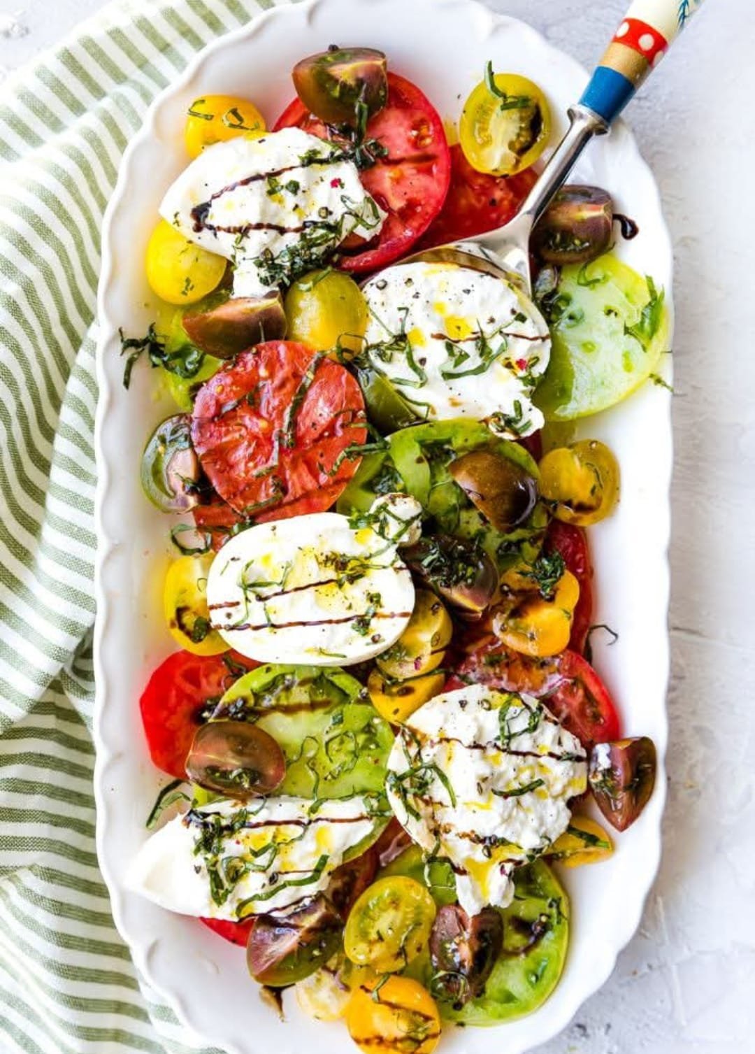 A: It’s best served fresh, but you can prep the tomatoes and store them separately up to a few hours ahead. Add burrata and dress just before serving.