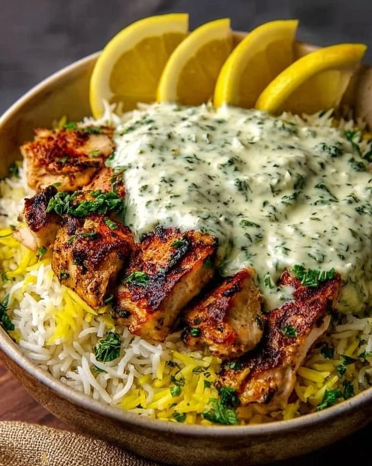 Tasty Grilled Chicken Over Saffron Rice with Creamy Herb Yogurt Sauce