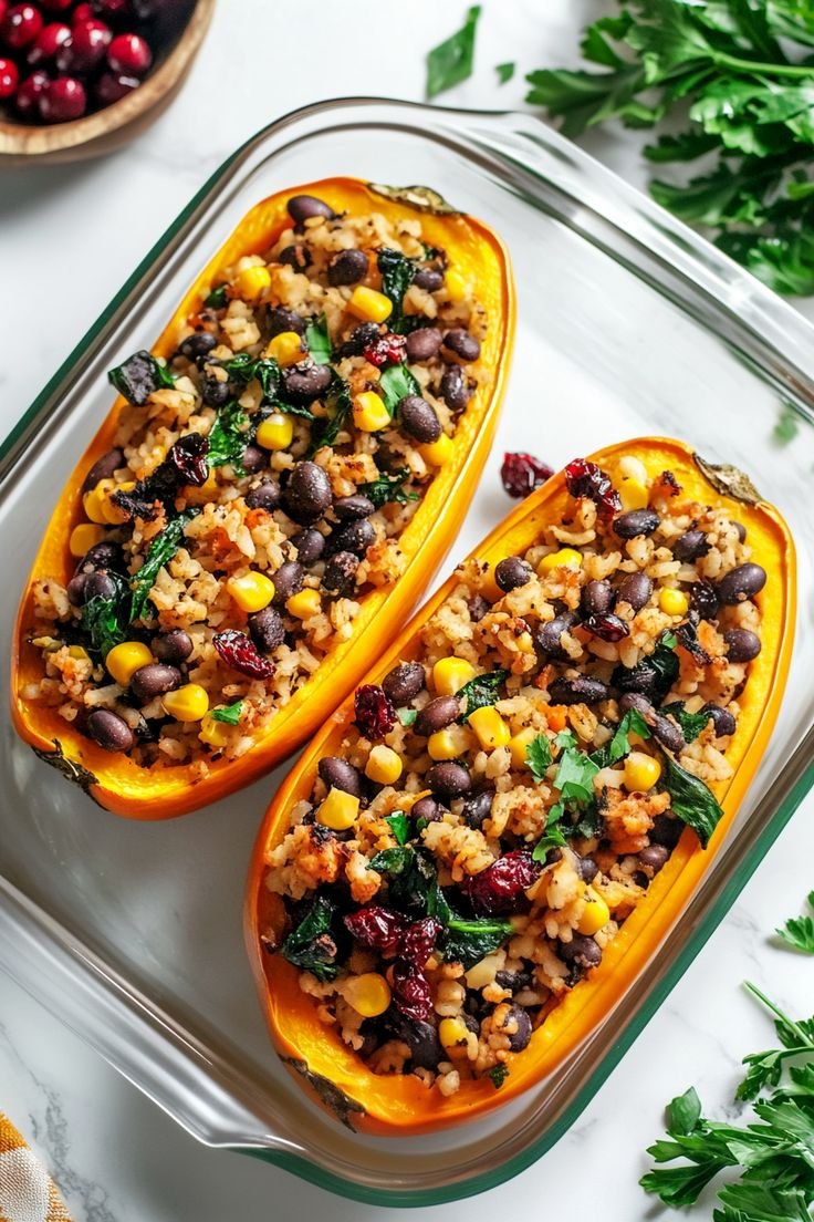 Roasted winter squash halves filled with a savory-sweet mixture of quinoa, chickpeas, herbs, nuts, and cranberries.