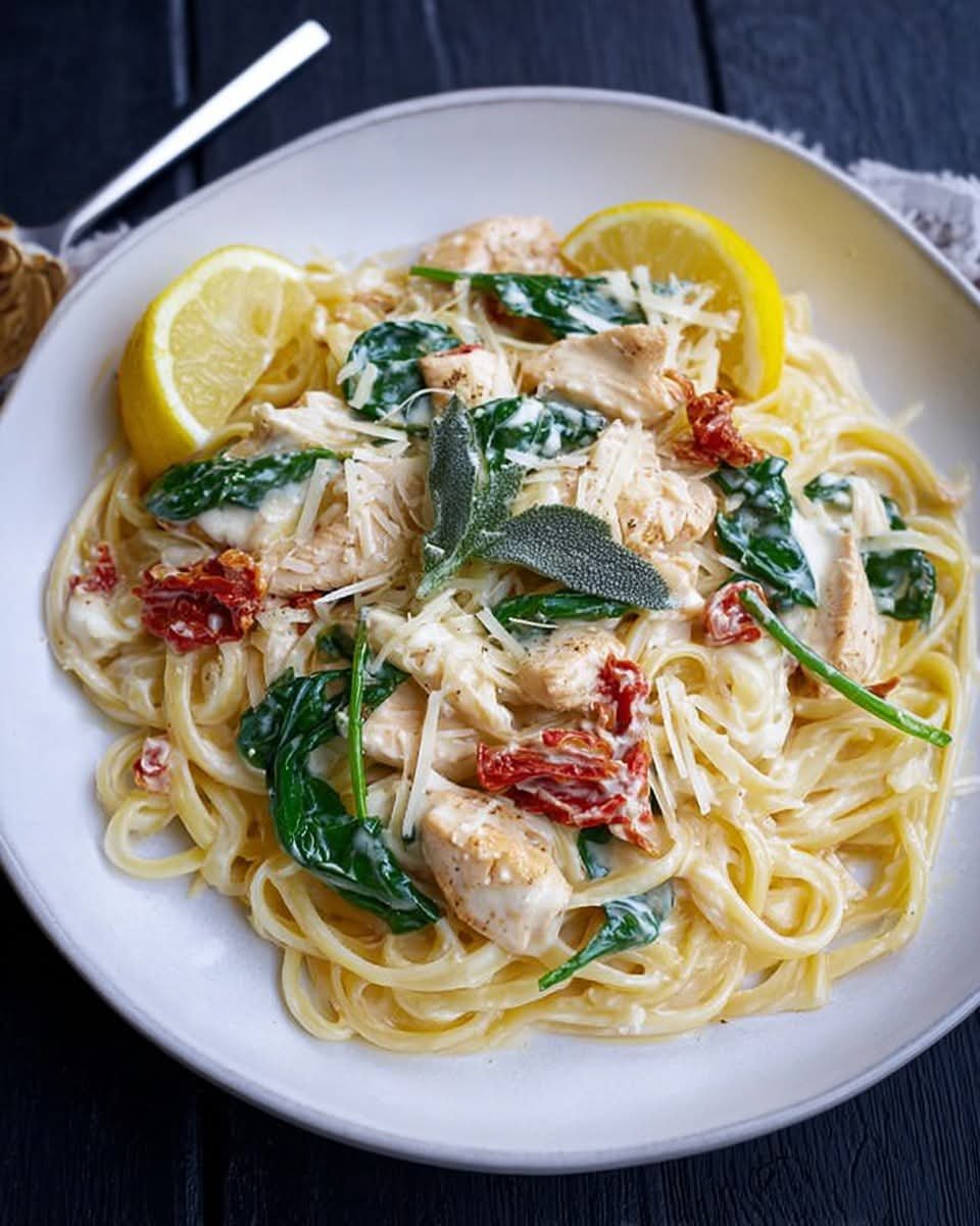 Tausa Chicken Pasta with Suga & Spinach Description: