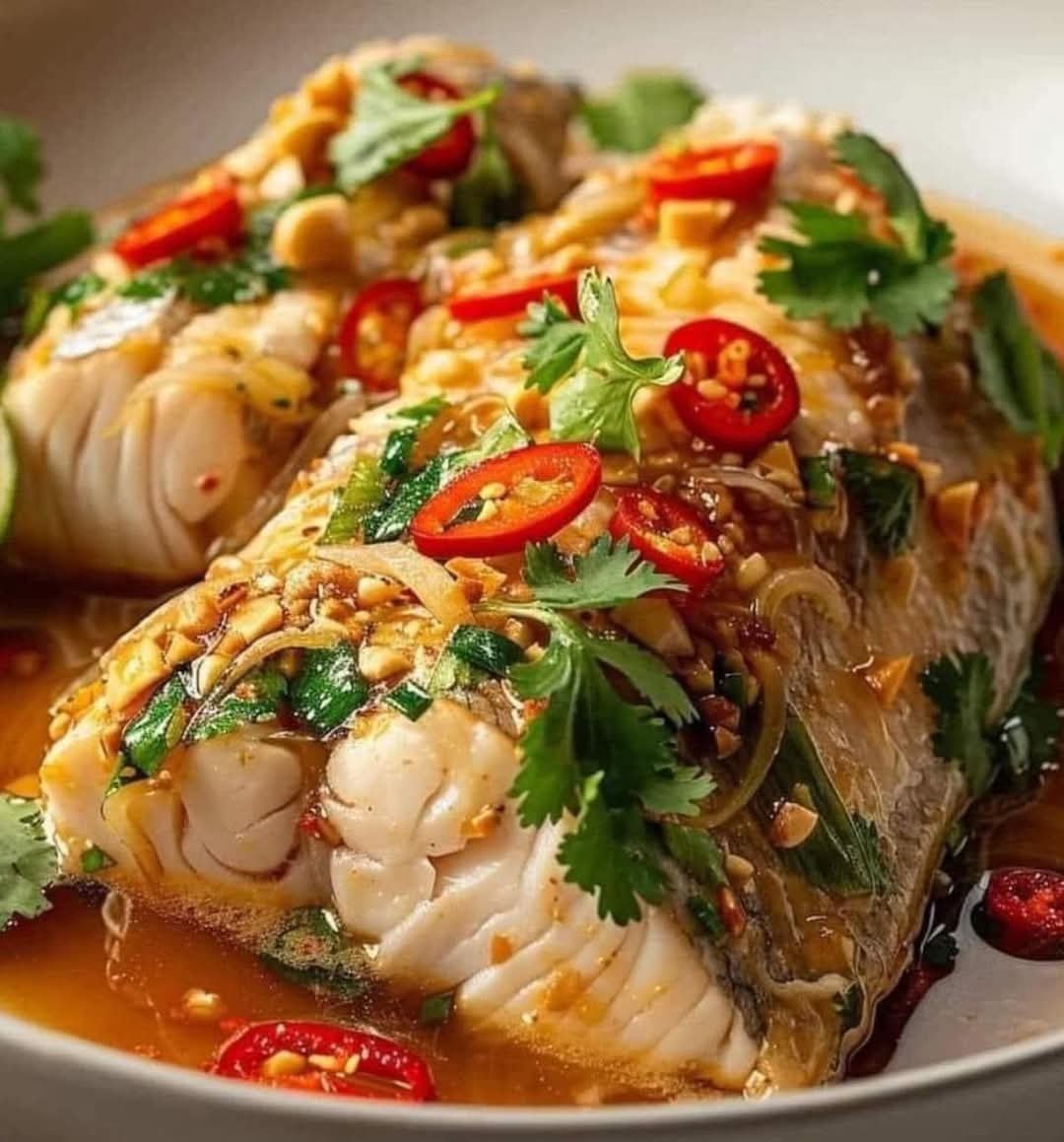 Thai Steamed Fish with Lime and Garlic is a light, aromatic, and healthy dish that perfectly balances spicy, tangy, and savory flavors. Fresh whole fish (or fillets) is gently steamed until tender, then topped with a zesty sauce made from lime juice, garlic, chilies, and fish sauce. This dish is a staple in Thai cuisine, commonly served with jasmine rice and fresh herbs.