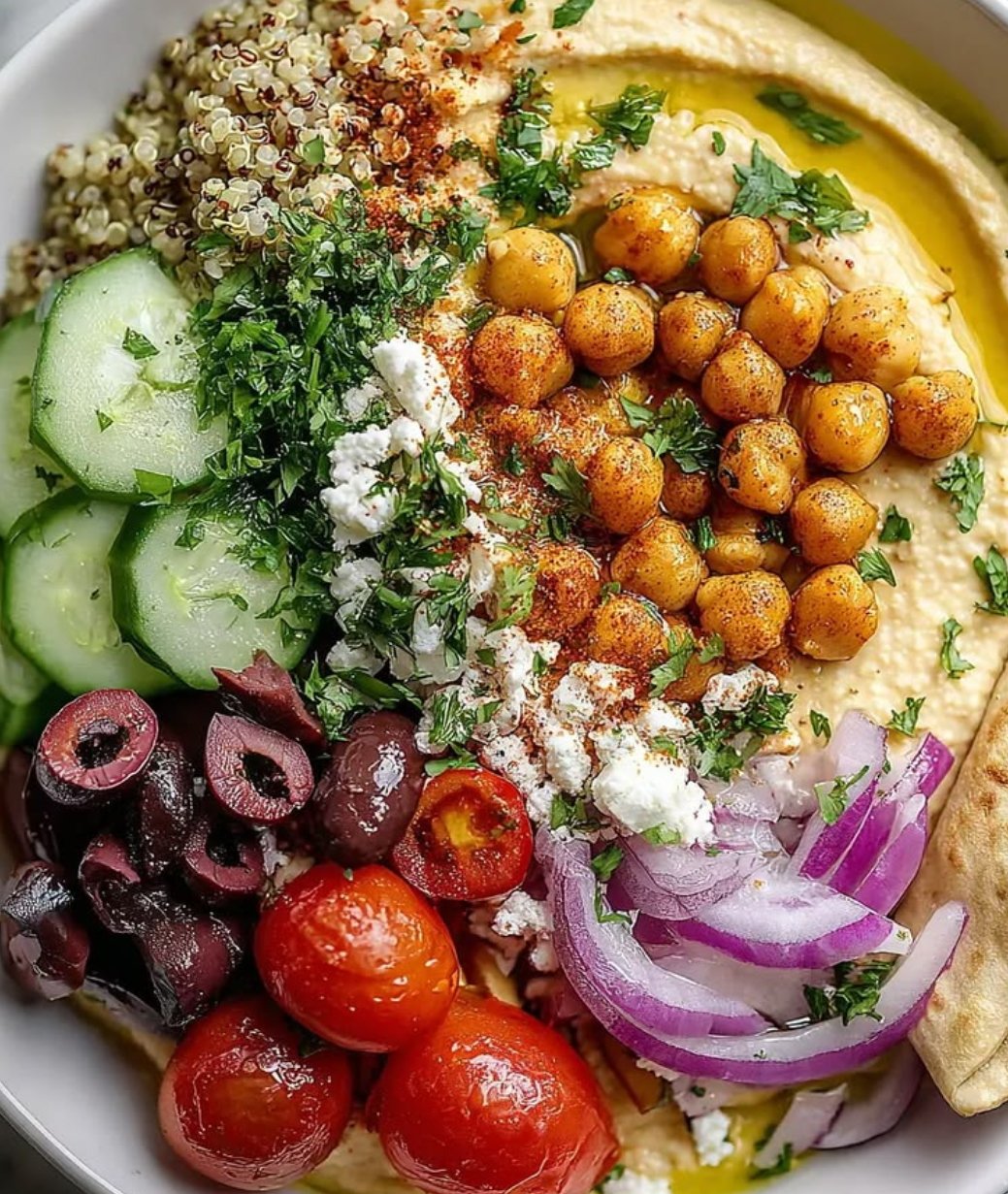 A creamy, comforting yet fresh Mediterranean bowl built around crispy roasted chickpeas, classic hummus, cucumber-tomato salad, and olive oil drizzle. Simple ingredients, BIG flavor — this is a go-to viral bowl people save, share, and remake.