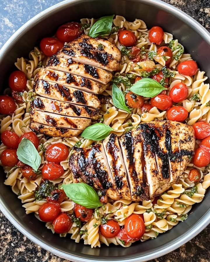 This dish combines the bright, tangy flavor of ripe tomatoes and fresh basil with the rich, smoky sweetness of balsamic-marinated grilled chicken. It’s a light yet satisfying meal, perfect for summer evenings or a healthy family dinner.