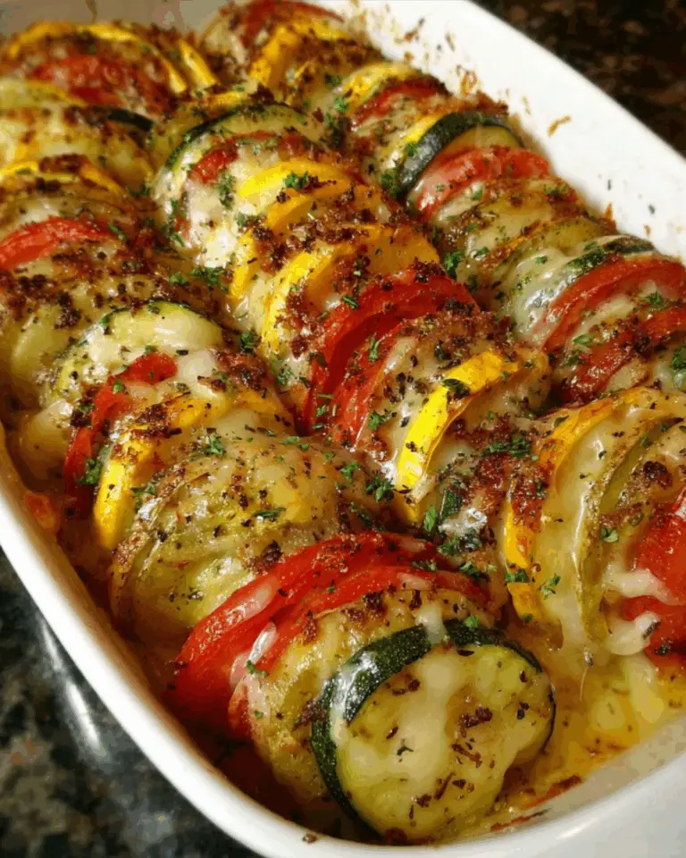 This colorful Tomato, Potato, Zucchini & Summer Squash Casserole is a comforting, oven-baked dish that celebrates simple vegetables layered with herbs, garlic, and cheese. It’s wholesome yet indulgent, perfect as a side dish or a light vegetarian main. The slow baking allows the vegetables to soften beautifully while the top turns golden and bubbly.