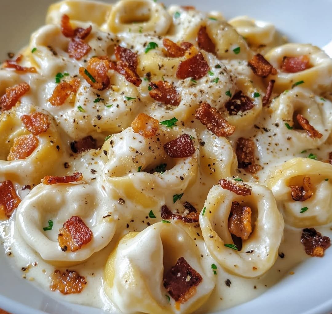 This comforting pasta dish combines pillowy cheese tortellini with a rich, velvety Alfredo sauce, finished with crunchy bites of smoky, crispy bacon. It’s indulgent, fast, and deeply satisfying — perfect for cozy nights when you crave something truly irresistible.