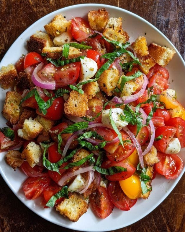 Panzanella is a traditional Italian salad from Tuscany made with day-old bread, ripe tomatoes, onions, cucumbers, and a simple olive oil and vinegar dressing. The bread absorbs all the delicious juices from the tomatoes and dressing, creating a fresh, hearty, and flavorful salad that’s perfect for summer meals or Mediterranean spreads.