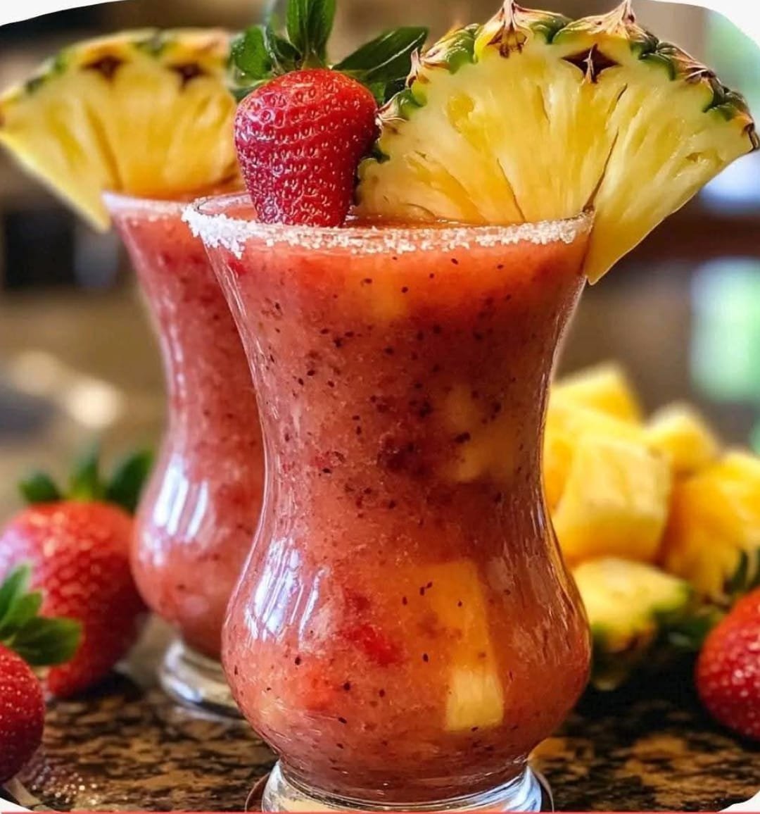 Garnish with a fresh strawberry, pineapple wedge, or a mint sprig.