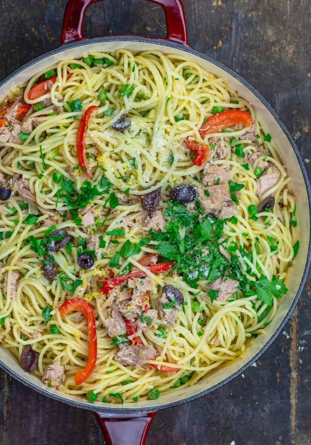 This simple tuna pasta recipe comes together in 20 minutes or less! You’ll love the texture and bold Mediterranean flavors thanks to ingredients like garlic, bell peppers, parsley, lemon, and a sprinkle of Parmesan cheese.