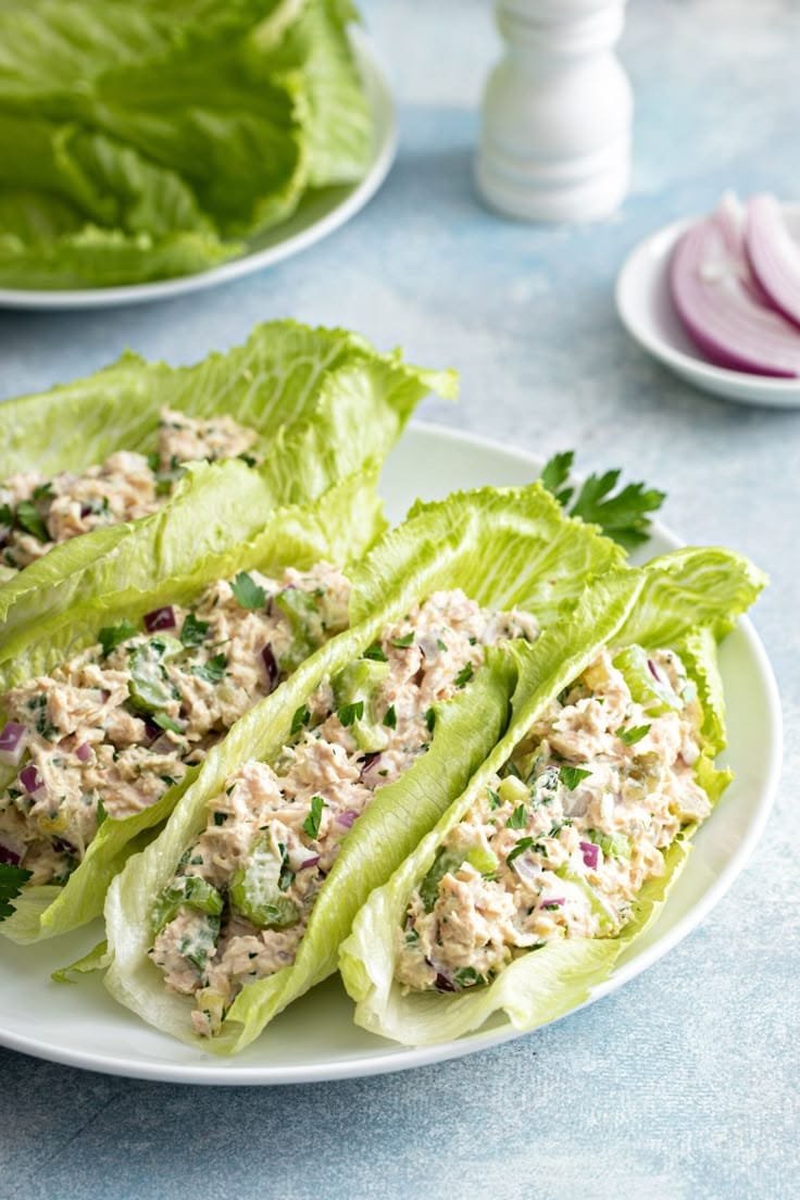 Crisp lettuce or veggie “boats” filled with zesty tuna salad for a clean, low-carb, and satisfying bite – no bread needed!